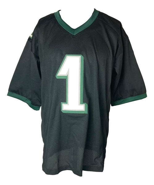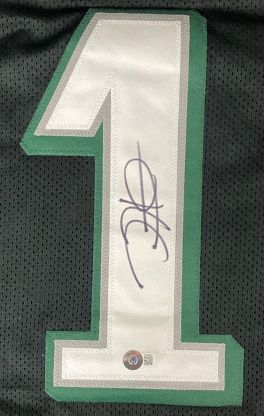 Featured is a Jalen Hurts signed custom football jersey. This jersey has been hand signed by Jalen Hurts comes with the Beckett hologram and certificate of authenticity. This jersey features professionally sewn letters and numbers and is size XL. This jersey has no team tags or emblems and is intended as a sports collectible. This jersey would make a great addition to any sports memorabilia collection. SPECIFICATIONS Autographed By: Jalen Hurts Team: Philadelphia Eagles Sport: Football Authentication: Beckett Grading Services