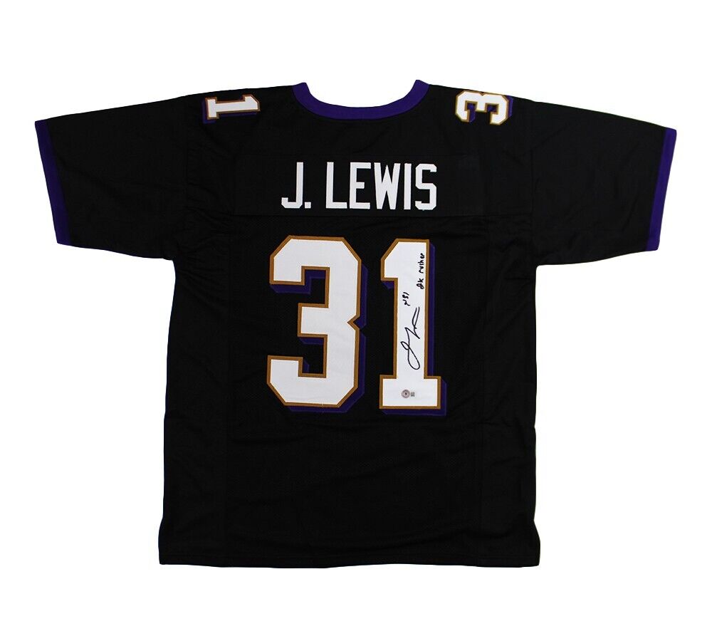 A Baltimore Custom Black Jersey hand signed by Jamal Lewis. The item and signature are in excellent condition. In addition to signing his name, Jamal also inscribed "2K Rusher" on the item. Jamal Lewis is a football running back. He played college football for the Tennessee Volunteers before being drafted by the Baltimore Ravens in the 1st round, 5th overall, in the 2000 NFL Draft. He is a Super Bowl Champ. In 2003 he was selected for the Pro Bowl, First Team All-Pro, NFL Offensive Player of the year and NFL Rushing Yards Leader of the year. AUTHENTICATION: The item is accompanied by a Beckett Serial Numbered and Databased Hologram