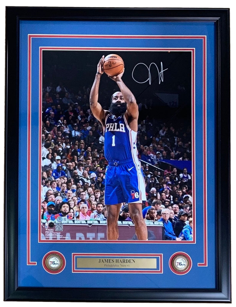 Featured is a James Harden signed 16x20 Philadelphia 76ers photo. This photo has been hand signed by Harden and comes with the Beckett witnessed hologram and certificate of authenticity. This photo has been professionally framed and matted and is approximately 22x27.. SPECIFICATIONS Autographed By: James Harden Team: Philadelphia 76ers Sport: Basketball Authentication: Beckett Grading Services