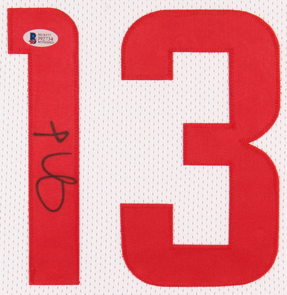 Custom framed display measures 35" x 43" in size. Features a jersey which has been hand-signed in black felt-tip pen by James Harden. The lot / autograph(s) includes an official Beckett Authentication Services serially numbered hologram and matching COA for authenticity purposes. The signing of this item was witnessed by Beckett.Authentication: Beckett COA