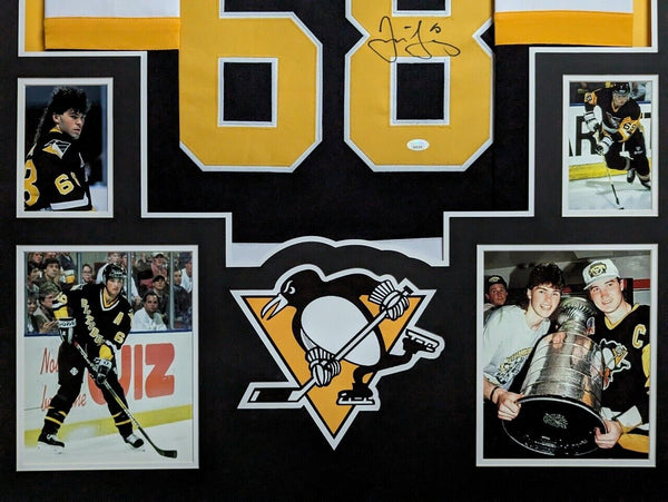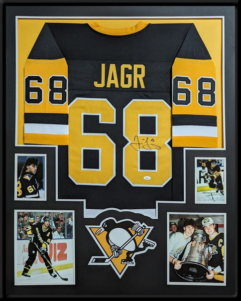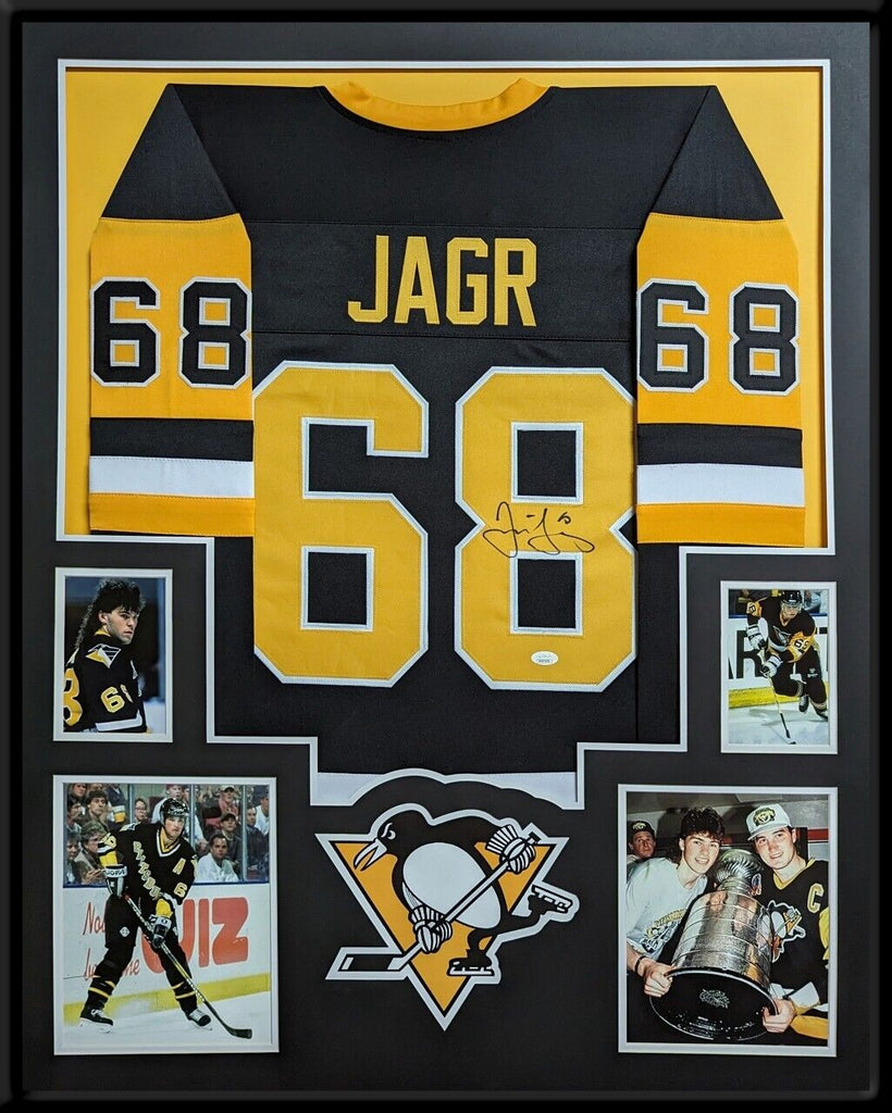 Custom Framed Jaromir Jagr hand signed Pittsburgh Penguins style custom jersey. JSA Hologram and COA with photo of signing taking place The authentication is from JSA. This signature is WITNESSED by a representative of JSA! 100% AUTHENTIC!!! The jersey has fully stitched numbers on the front and back. It is a great item and a must for all great sports fans! This item is professionally framed, it measures 32"x40" inside , 42"x34" outside , using UV protective Acrylic glass for safe keeping and safe transport, team color matting, black moulding and hanging hooks on the back. All additional items in frame seen in pictures included. 100% ready to hang in your fan cave.