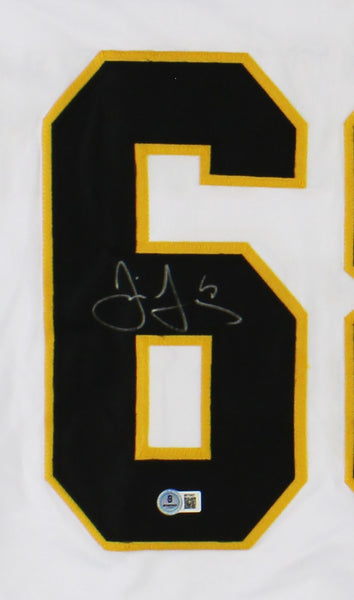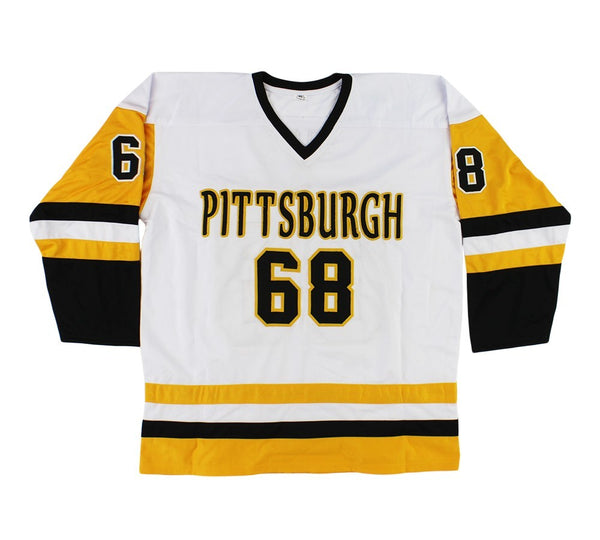A Pittsburgh Penguins Custom White NHL Jersey hand signed by Jaromir Jagr. The item and signature are in excellent condition. Jaromir is a former NHL player. He is an Olympian, a World Cup winner and a World Champion. AUTHENTICATION: The item is accompanied by a Beckett Serial Numbered and Databased Hologram.