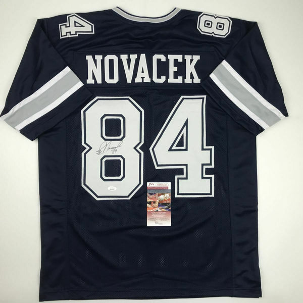 Autographed/Signed JAY NOVACEK Dallas Dark Blue Football Jersey JSA COA Auto This is a custom jersey and was not manufactured by or in any manner associated with any professional sports league or manufacturer. This custom jersey carries no professional sports league designation. The item is intended to be an autographed collectible. Reference of team in the title is to allow the purchaser a point of association. The custom jersey displays the name, number and authenticated signature of the player. This item in no way is affiliated with or connected to any professional sports organization. The autograph, as always is guaranteed to be authentic and has been certified as authentic by a third-party, trusted authenticator. Size is XL unless otherwise noted.