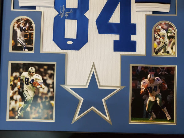 Framed Jay Novacek signed Dallas Cowboys style Custom Jersey. JSA Hologram and COA The authentication is from JSA. This signature is authenticated by a representative of JSA! 100% AUTHENTIC!!! The jersey has fully stitched numbers on the front and back. No tags or logos. This is not an official NFL jersey but it is very high quality. It is a great item and a must for all great sports fans! This item is professionally framed, it measures 32"x40" inside , 42"x34" outside , using UV protective Acrylic glass for safe keeping and safe transport, team color matting, black moulding and hanging hooks on the back. All additional items in frame seen in pictures included. 100% ready to hang in your fan cave.