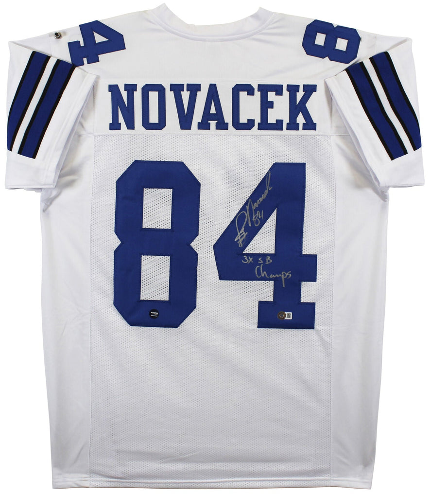 This Autographed White Pro Style Jersey with the inscription of "3x SB Champ" has been Personally Signed by Jay Novacek of the Dallas Cowboys. This item is 100% Authentic to include a hologram by Beckett Authentication Services. This item will come with an affixed Beckett Authentication Services (BAS) authentication sticker, which includes a scannable QR code to verify authenticity. Please note that Beckett no longer provides serial-numbered COA cards, and the attached BAS sticker will serve as the complete authentication for this item. This is a BAS Witnessed Protection Program item which means a Beckett Authentication Service representative was present when this item was being signed. We conducted an autograph signing with Jay Novacek where multiples of the same item were signed. While the photographs are representative of this item, the size, placement and strength of the signature may vary. Each item is hand signed, therefore, each autograph is unique. This item can be verified through BAS Witnessed. This is a X-Large sized, non-branded, custom-stitched Jersey.
