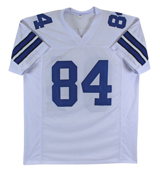 This Autographed White Pro Style Jersey has been Personally Signed by Jay Novacek of the Dallas Cowboys. This item is 100% Authentic to include a Certificate of Authenticity (COA) / hologram by Beckett Authentication Services. This is a BAS Witnessed Protection Program item which means a Beckett Authentication Service representative was present when this item was being signed. This is a stock item. We conducted an autograph signing with Jay Novacek and we have several of these available. The one you will receive will be of equal quality to the one pictured. This item can be verified through BAS Witnessed. This is a X-Large sized, non-branded, custom-stitched Jersey.