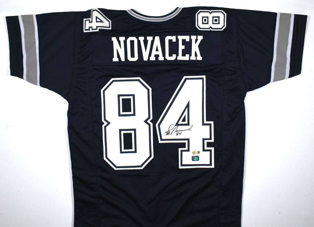 THIS IS NOT AN NFL JERSEY. THIS HAS NO TAGS, NO LOGOS, NO EMBLEMS. This is a hand autograph of Jay Novacek on a Custom Made (non name brand) Authentic Style Jersey with stitched letters and numbers. This item has a Beckett Witnessed Authentication, which comes with a Beckett numbered sticker hologram and a QR Code for verification. You can view this item on the Beckett Authentication website and it shows when and where the item was signed. It was signed either at a public autograph appearance or a private signing. This is a stock photo of the item. Although you may not receive this exact item, the item you receive is virtually identical and brand new in great shape. Jersey size is XL. THIS IS NOT AN NFL JERSEY. THIS HAS NO TAGS, NO LOGOS, NO EMBLEMS. This is a hand autograph of Jay Novacek on a Custom Made (non name brand) Authentic Style Jersey with stitched letters and numbers. This item has a Beckett Witnessed Authentication, which comes with a Beckett numbered sticker hologram and a QR Code for verification. You can view this item on the Beckett Authentication website and it shows when and where the item was signed. It was signed either at a public autograph appearance or a private signing. This is a stock photo of the item. Although you may not receive this exact item, the item you receive is virtually identical and brand new in great shape. Jersey size is XL.