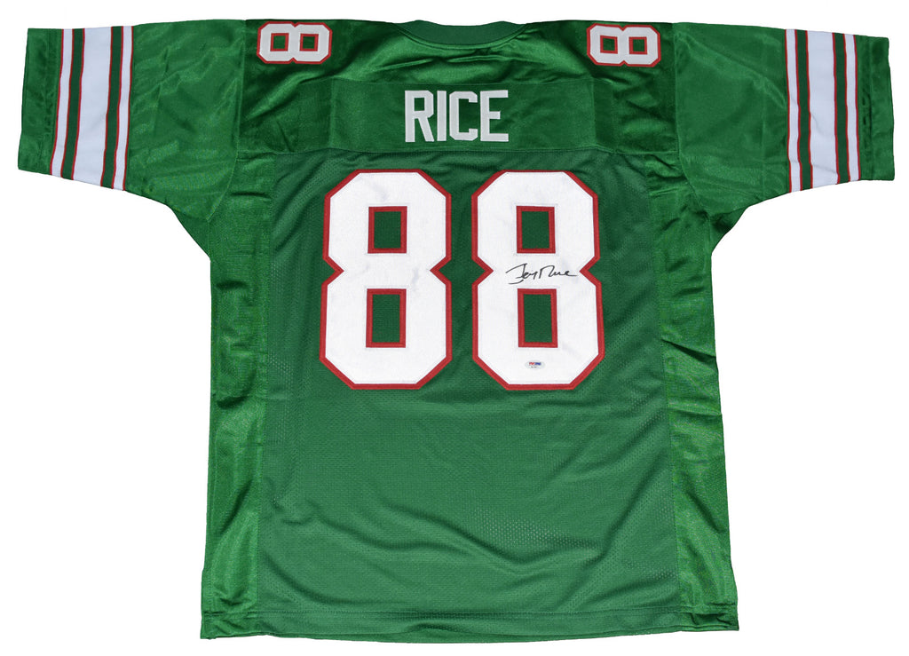 Jerry Rice, the greatest wide receiver of all-time, has hand signed this green custom jersey at a private signing. Jersey is size XL and all letters/numbers are sewn-on. This item comes with a certificate of authenticity (COA) from PSA/DNA, one of the best authenticators in the industry. You will receive a serial-numbered COA along with a matching serial-numbered sticker on the jersey. The authenticity can be verified online by entering the serial number.Item pictured may not be the exact item you will receive. It will be similar quality, and we guarantee your satisfaction.