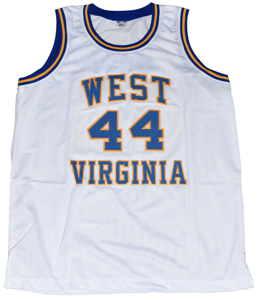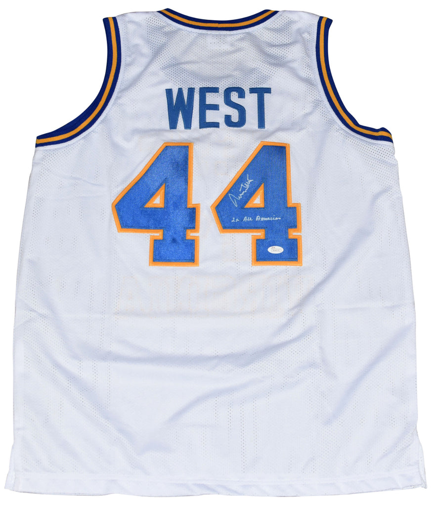 Jerry West, former All-American for the West Virginia Mountaineers, has hand signed this white custom jersey at a private signing. He included the inscription "2x All-American" with his signature. Jersey is size XL and all letters/numbers are sewn-on. This item comes with a certificate of authenticity (COA) from JSA - James Spence Authentication and was signed in the presence of one of their representatives. You will receive a serial-numbered COA along with a matching serial-numbered sticker on the jersey. The authenticity can be verified online by entering the serial number.Item pictured may not be the exact item you will receive. It will be similar quality, and we guarantee your satisfaction.