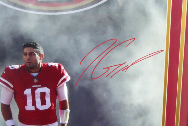 This is a framed 16x20 Photo, approximately 24x28 with the frame, that has been hand signed by Jimmy Garoppolo. This item has been certified authentic by Tri-Star & Beckett (BAS) and comes with each of their tamper-proof stickers and matching certificate of authenticity.