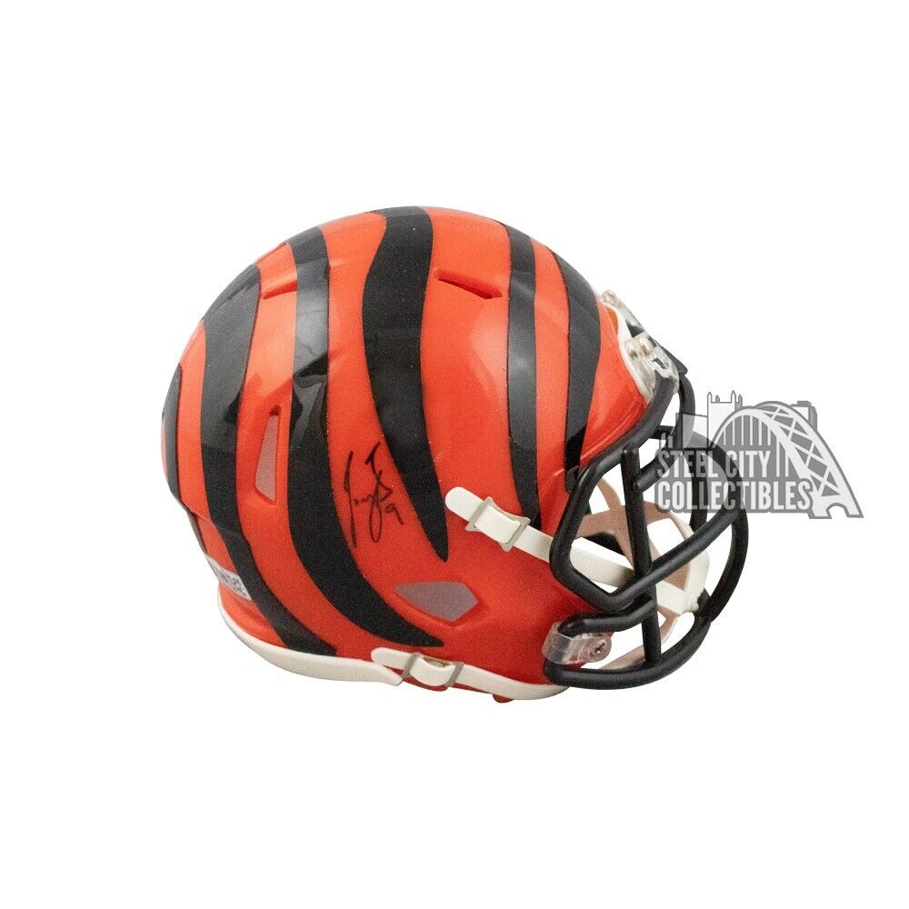 This Joe Burrow autographed Cincinnati Bengals mini helmet is authenticated by Fanatics. Autograph is signed in black ink.