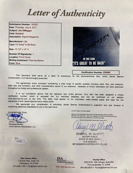 Featured is a Joe DiMaggio signed 1949 LIFE magazine. This magazine has been hand signed by DiMaggio and comes with the JSA hologram and letter of authenticity. This magazine would make a great addition to any sports memorabilia collection! SPECIFICATIONS Autographed By: Joe DiMaggio Team: New York Yankees Sport: Golf-PGA Authentication: James Spence Authentication (JSA)