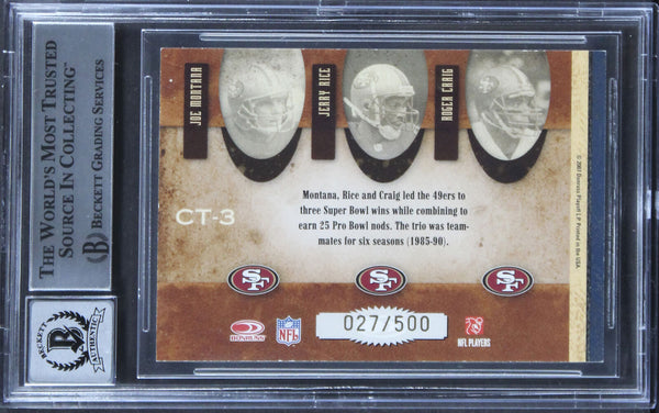 This Autographed Auto Graded Gem Mint 10! 2007 Doruss Classics Classic Triples Bronze #3 Card has been Personally Signed by Joe Montana, Jerry Rice & Roger Craig of the San Francisco 49ers. This item is 100% Authentic, it comes slabbed and authenticated by Beckett Authentication Services. The authenticity can be verified on Beckett Authentication Services website.