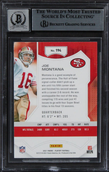 This Autographed Auto Graded Gem Mint 10! 2021 Playoff #194 Card has been Personally Signed by Joe Montana of the San Francisco 49ers. This item is 100% Authentic, it comes slabbed and authenticated by Beckett Authentication Services. The authenticity can be verified on Beckett Authentication Services website.