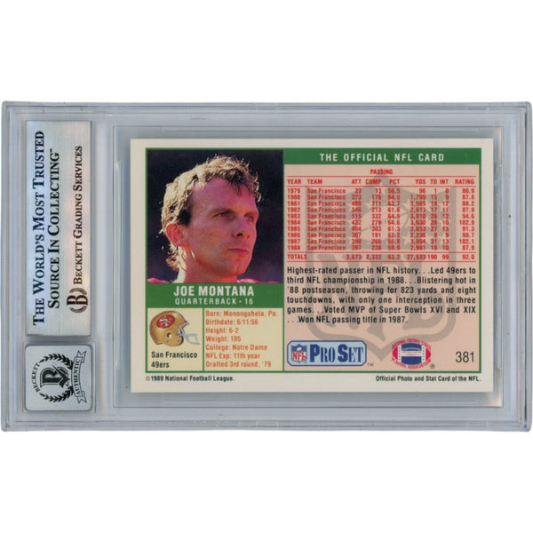 The number in the listing title is just an inventory sku for our records and is not the authentication number. This is a stock photo, unless otherwise noted. This is a San Francisco 49ers 1989 NFL Pro Set #381 Slabbed Trading Card that was personally autographed by Joe Montana. Includes a certificate of authenticity from Beckett Authentication Services (BAS) and Denver Autographs.FREE SHIPPING within the USA on orders over $10!