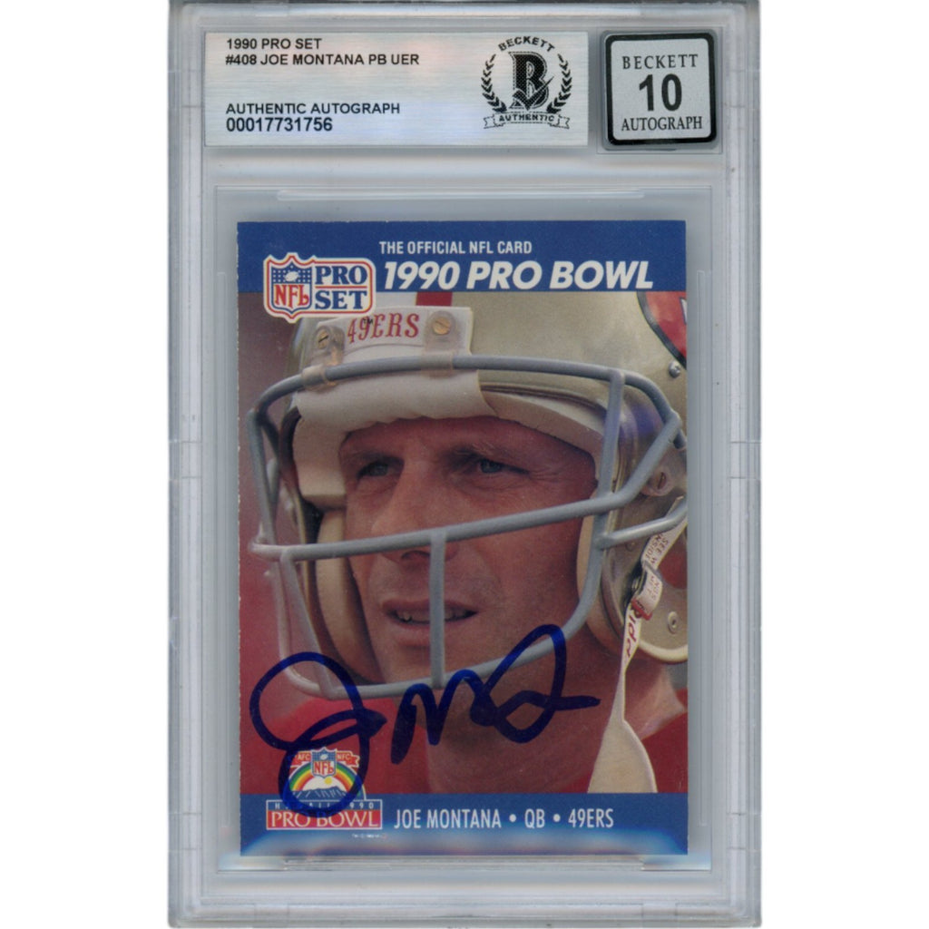 The number in the listing title is just an inventory sku for our records and is not the authentication number. The item pictured is the exact item you will receive, please see photos for condition. This is a San Francisco 49ers 1990 NFL Pro Set #408 Slabbed Trading Card that was personally autographed by Joe Montana. Includes a certificate of authenticity from Beckett Authentication Services (BAS) and Denver Autographs.FREE SHIPPING within the USA on orders over $10!