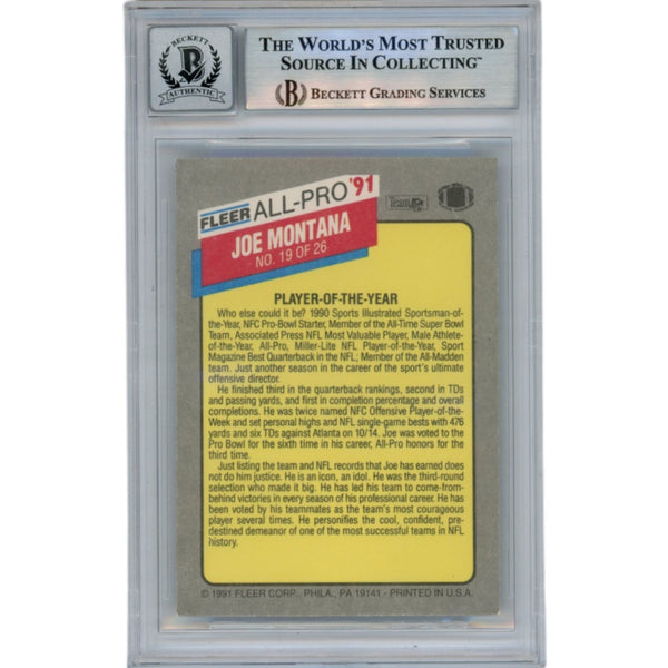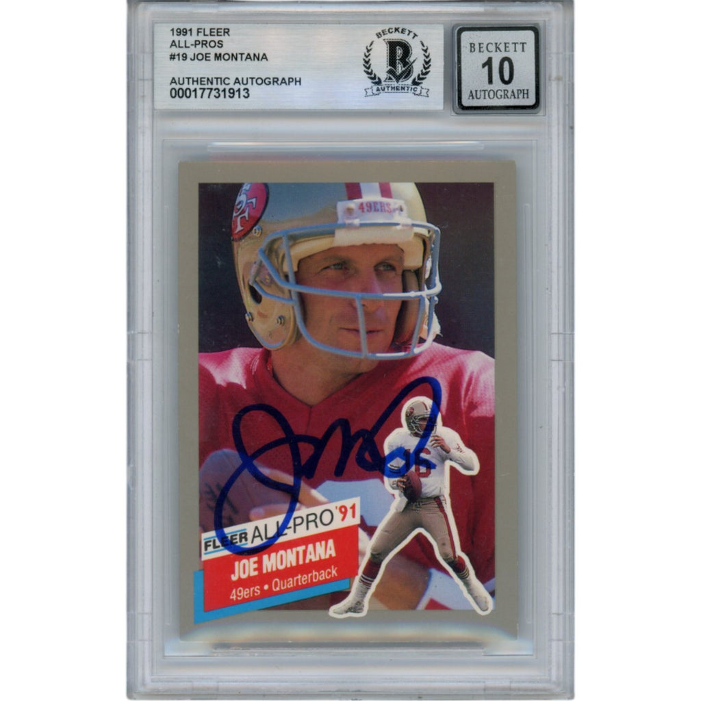 The number in the listing title is just an inventory sku for our records and is not the authentication number. The item pictured is the exact item you will receive, please see photos for condition. This is a San Francisco 49ers 1991 Fleer All-Pro #19 Slabbed Trading Card that was personally autographed by Joe Montana. Includes a certificate of authenticity from Beckett Authentication Services (BAS) and Denver Autographs.FREE SHIPPING within the USA on orders over $10!