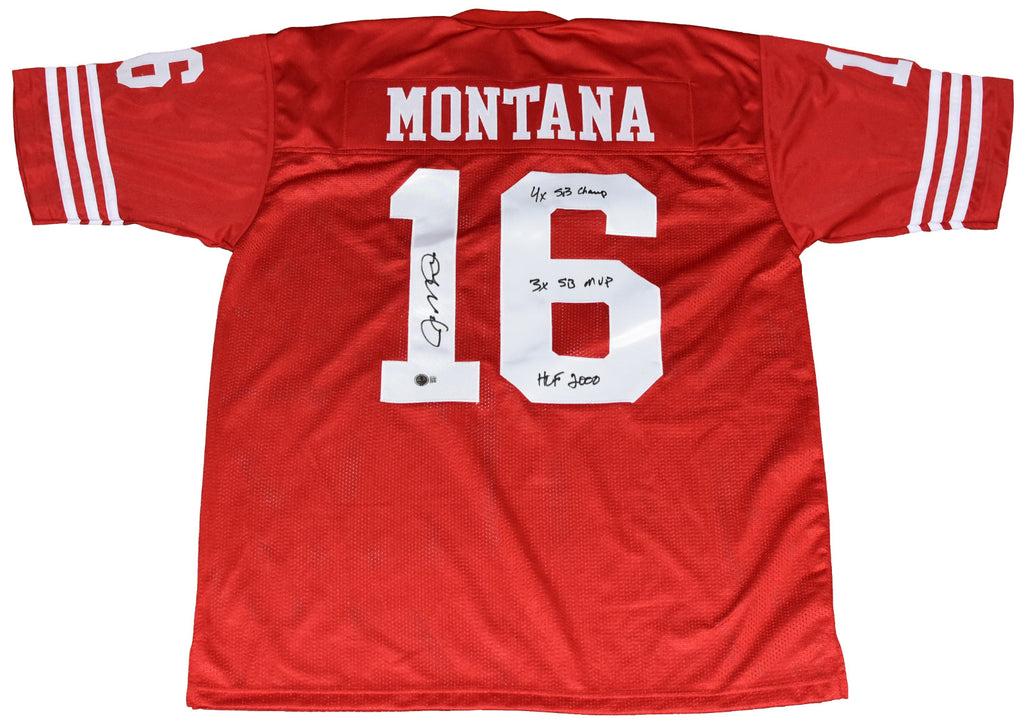 Joe Montana, former Hall of Fame quarterback for the San Francisco 49ers, has hand signed this red custom jersey at a private signing. He included 3 inscriptions with his signature; 4x SB Champ, 3x SB MVP and HOF 2000. Jersey is size XL and all letters/numbers are sewn-on. This item is authenticated by Beckett Authentication Services and was signed in the presence of one of their representatives. Their tamper-evident hologram featuring a QR code and serial number is on the item. The authenticity can be verified online by entering the serial number or scanning the QR code.Item pictured may not be the exact item you will receive. It will be similar quality, and we guarantee your satisfaction.