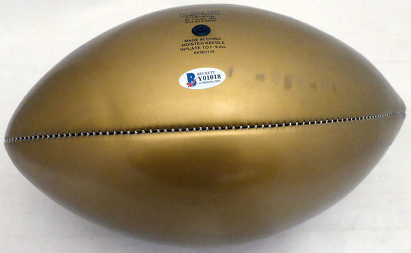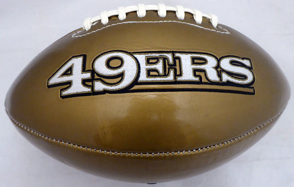 This is a San Francisco 49ers gold logo football that has been hand signed by Joe Montana. It has been authenticated by Beckett (BAS) and comes with their sticker and matching certificate of authenticity.