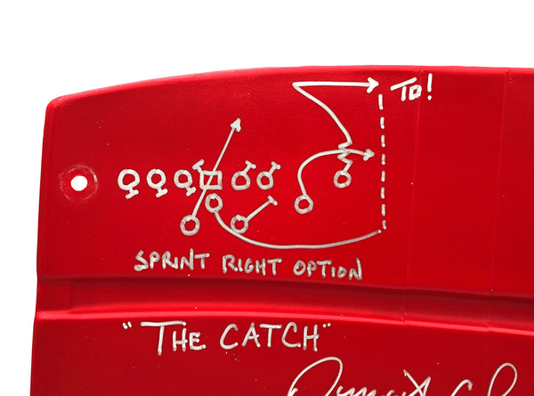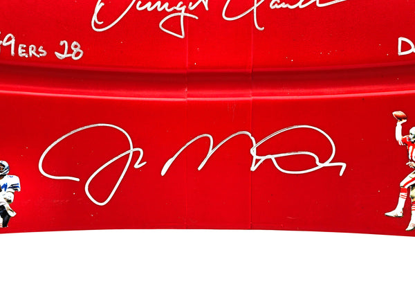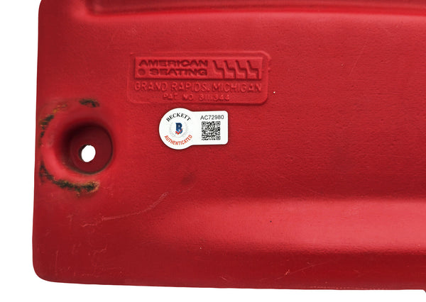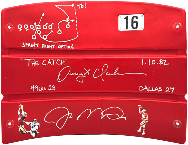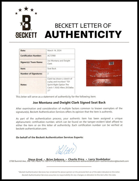 This is a Red Stadium Used Candlestick Park Seatback that has been hand signed by Joe Montana & Dwight Clark. This item was inscribed "The Catch", "49ers 28 Dallas 27", and the 'Sprint Right Option Play' was also inscribed with a sketch of the play. This item measures H: 15", W: 19", D: 4".This item has been certified authentic by Beckett Authentication (BAS) and comes with their tamper-proof QR Code sticker and full-page certificate of authenticity.