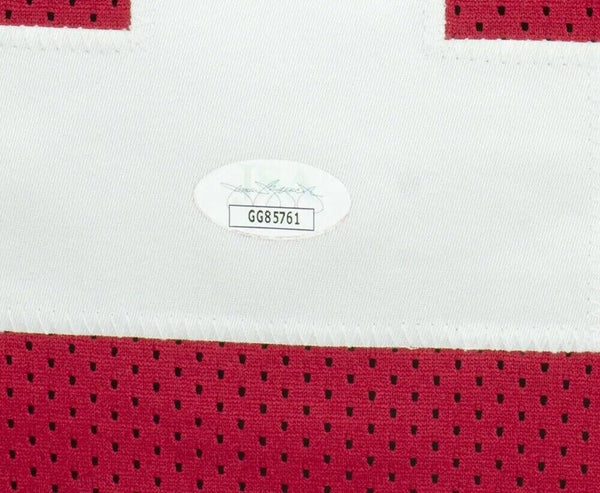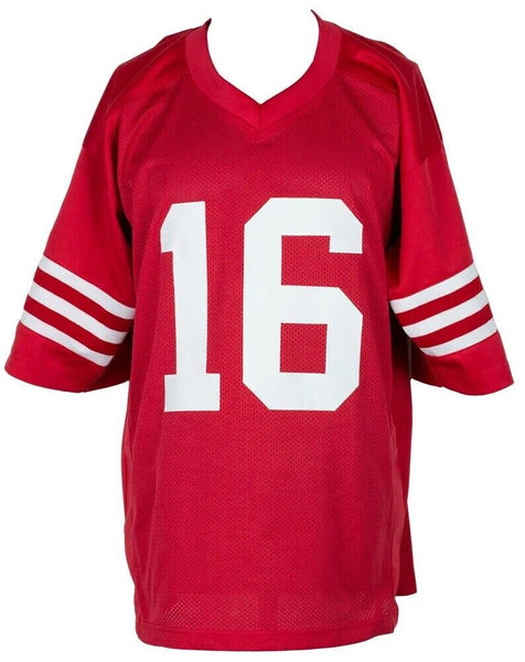 Featured is a Joe Montana signed red custom pro style football jersey. This jersey was hand signed by Joe Montana and authenticated by JSA authentication services. Included with the jersey is a JSA hologram and certificate of authentication. This jersey would make a great additional to any sports memorabilia collection. This jersey has hand sewn numbers and letter and has NO logos or any affiliation with any manufacturer or team. It is simply intended as an autographed collectible.. SPECIFICATIONS Autographed By: Joe Montana Team: San Francisco Sport: Football Authentication: James Spence Authentication (JSA)