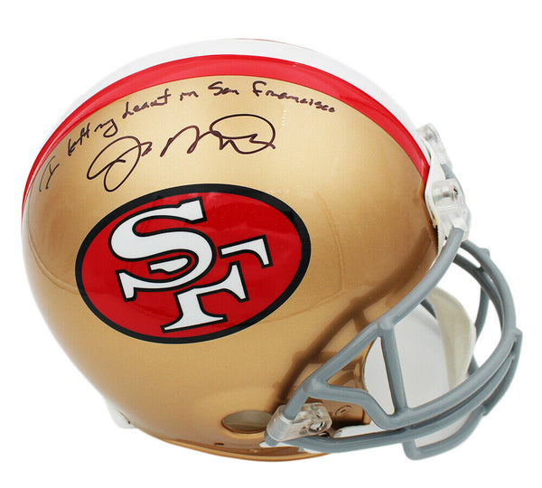 A San Francisco 49ers Proline Authentic NFL Helmet hand signed by Joe Montana. The item and signature are in excellent condition. In addition to signing his name, Joe also inscribed "I left my heart in San Francisco" on the item. Joe is an 8x Pro Bowler, a 6x All-Pro, 4x Super Bowl Champion, 3x Superbowl MVP, 2x NFL MVP and Class of 2000 Hall of Famer. AUTHENTICATION: The item is accompanied by a Fanatics Authentic Certificate of Authenticity - Fanatics Authentic Serial Numbered and Databased Hologram - Picture of Joe from the Signing -