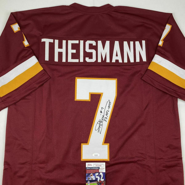 Autographed/Signed JOE THEISMANN 83 MVP Washington Burgundy Jersey JSA COA Auto This is a custom jersey and was not manufactured by or in any manner associated with any professional sports league or manufacturer. This custom jersey carries no professional sports league designation. The item is intended to be an autographed collectible. Reference of team in the title is to allow the purchaser a point of association. The custom jersey displays the name, number and authenticated signature of the player. This item in no way is affiliated with or connected to any professional sports organization. The autograph, as always is guaranteed to be authentic and has been certified as authentic by a third-party, trusted authenticator. Size is XL unless otherwise noted.