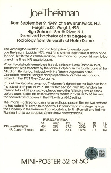 The number in the listing title is just an inventory sku for our records and is not the authentication number. This is a stock photo of the item that you will receive. This is a mini poster measuring 8.5" x 5.5" that was personally autographed by Joe Theismann. Includes a certificate of authenticity from Beckett Authentication Services (BAS) and Denver Autographs.FREE SHIPPING within the USA on orders over $10!
