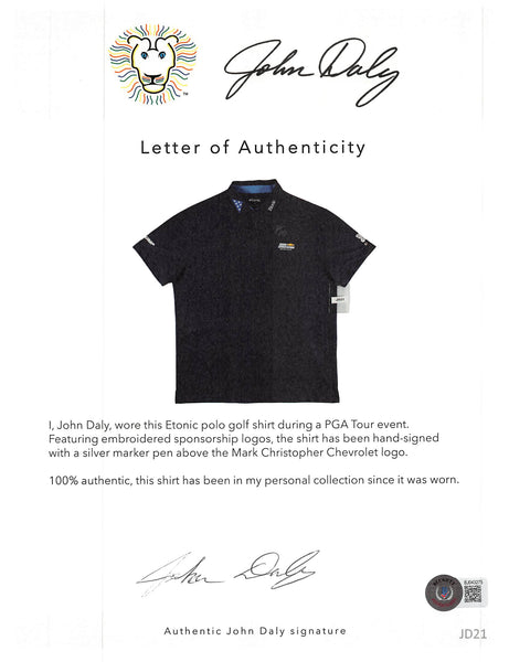 This Autographed Match Worn Blue Folds Of Honor Mark Christopher Chevy Etonic Polo Shirt has been Personally Signed by John Daly. This item is 100% Authentic to include a hologram by Beckett Authentication Services. This item will come with an affixed Beckett Authentication Services (BAS) authentication sticker, which includes a scannable QR code to verify authenticity. Please note that Beckett no longer provides serial-numbered COA cards, and the attached BAS sticker will serve as the complete authentication for this item. The authenticity can be verified on Beckett Authentication Services website. This is a XXX-Large sized Shirt. This match worn Etonic Polo shirt has been worn by John Daly, and comes with a letter of Authenticity from John Daly certifying this is match worn & provenance of the item coming from his personal collection.