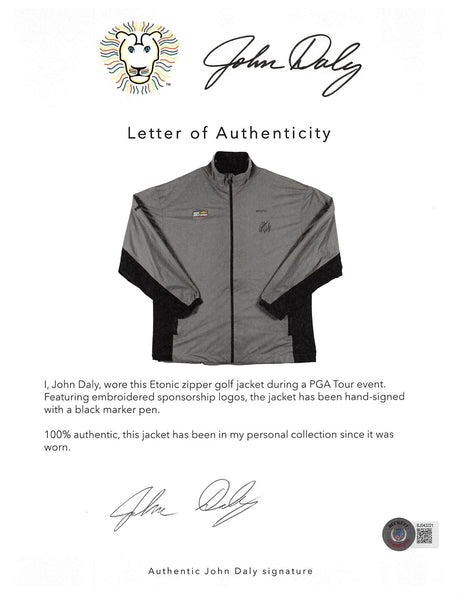 This Autographed Match Worn Gray Mark Christopher Etonic Golf Jacket has been Personally Signed by John Daly. This item is 100% Authentic to include a hologram by Beckett Authentication Services. This item will come with an affixed Beckett Authentication Services (BAS) authentication sticker, which includes a scannable QR code to verify authenticity. Please note that Beckett no longer provides serial-numbered COA cards, and the attached BAS sticker will serve as the complete authentication for this item. The authenticity can be verified on Beckett Authentication Services website. This is a XXX-Large sized Jacket. This match worn Etonic jacket has been worn by John Daly, and comes with a letter of Authenticity from John Daly certifying this is match worn & provenance of the item coming from his personal collection.
