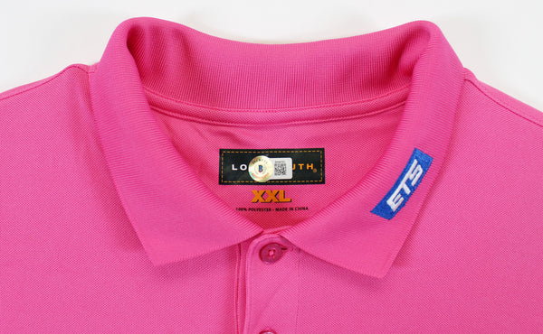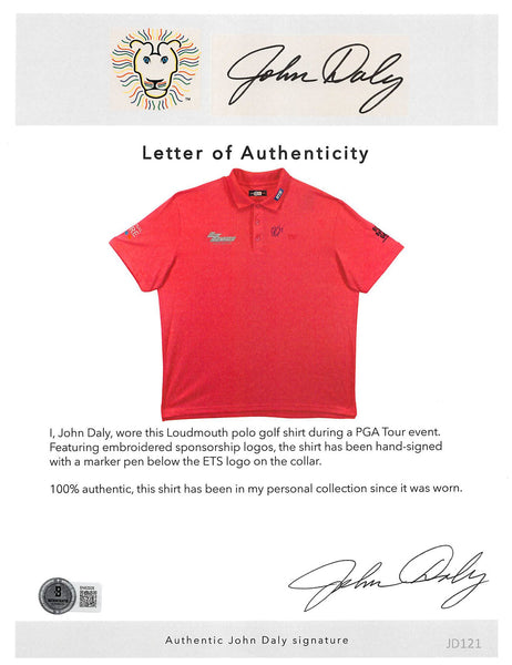This Autographed Match Worn Pink Loudmouth Mark Christopher National Core ETS Rock Bottom Golf Polo Shirt has been Personally Signed by John Daly. This item is 100% Authentic to include a hologram by Beckett Authentication Services. This item will come with an affixed Beckett Authentication Services (BAS) authentication sticker, which includes a scannable QR code to verify authenticity. Please note that Beckett no longer provides serial-numbered COA cards, and the attached BAS sticker will serve as the complete authentication for this item. The authenticity can be verified on Beckett Authentication Services website. This is a XX-Large sized Shirt. This Match Worn Pink Loudmouth Mark Christopher National Core ETS Rock Bottom Golf Polo shirt has been worn by John Daly, and comes with a letter of Authenticity from John Daly certifying this is match worn & provenance of the item coming from his personal collection.