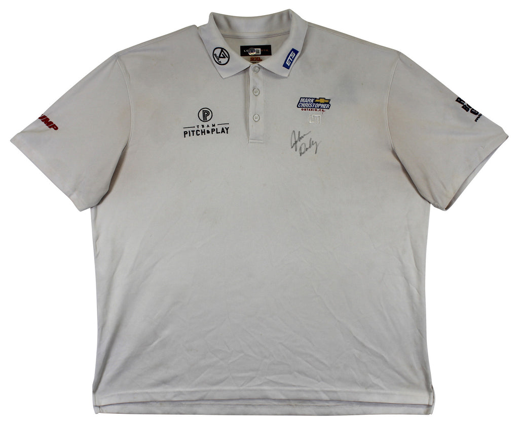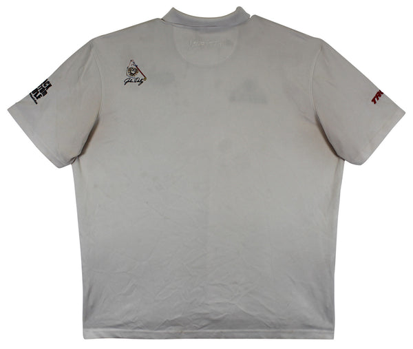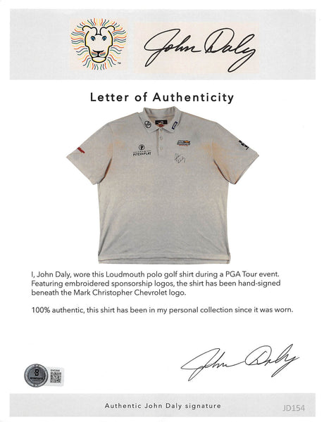 This Autographed Match Worn White Loudmouth Mark Christopher Team Pitch & Play Rock Bottom Golf Trump Polo Shirt has been Personally Signed by John Daly. This item is 100% Authentic to include a hologram by Beckett Authentication Services. This item will come with an affixed Beckett Authentication Services (BAS) authentication sticker, which includes a scannable QR code to verify authenticity. Please note that Beckett no longer provides serial-numbered COA cards, and the attached BAS sticker will serve as the complete authentication for this item. The authenticity can be verified on Beckett Authentication Services website. This is a XX-Large sized Shirt. This Match Worn White Loudmouth Mark Christopher Team Pitch & Play Rock Bottom Golf Trump Polo shirt has been worn by John Daly, and comes with a letter of Authenticity from John Daly certifying this is match worn & provenance of the item coming from his personal collection.