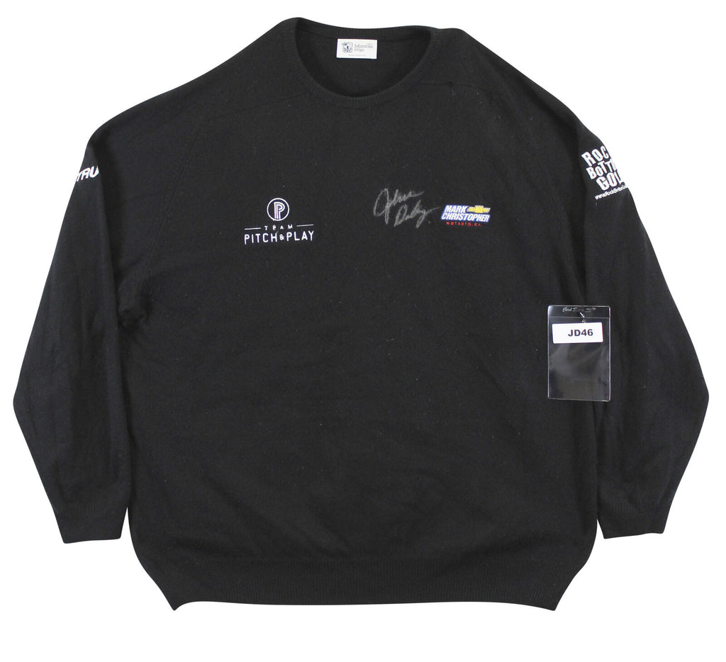 This Autographed Match Worn Black Team Pitch & Play Mark Christopher Chevy Rock Bottom Golf Trump Johnstons of Elgin Cashmere Sweater has been Personally Signed by John Daly. This item is 100% Authentic to include a hologram by Beckett Authentication Services. This item will come with an affixed Beckett Authentication Services (BAS) authentication sticker, which includes a scannable QR code to verify authenticity. Please note that Beckett no longer provides serial-numbered COA cards, and the attached BAS sticker will serve as the complete authentication for this item. The authenticity can be verified on Beckett Authentication Services website. This match worn Johnstons of Elgin cashmere sweater has been worn by John Daly, and comes with a letter of Authenticity from John Daly certifying this is match worn & provenance of the item coming from his personal collection.