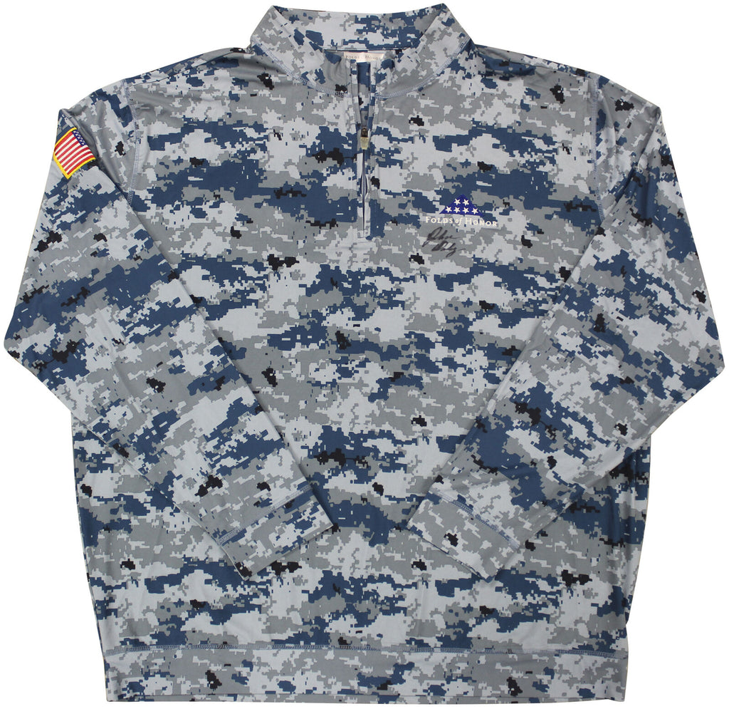 This Autographed Match Worn Camouflage Folds of Honor Quarter Zip Shirt has been Personally Signed by John Daly. This item is 100% Authentic to include a hologram by Beckett Authentication Services. This item will come with an affixed Beckett Authentication Services (BAS) authentication sticker, which includes a scannable QR code to verify authenticity. Please note that Beckett no longer provides serial-numbered COA cards, and the attached BAS sticker will serve as the complete authentication for this item. The authenticity can be verified on Beckett Authentication Services website. This is a XXX-Large sized Shirt. This match worn Folds of Honor quarter zip shirt has been worn by John Daly, and comes with a letter of Authenticity from John Daly certifying this is match worn & provenance of the item coming from his personal collection.