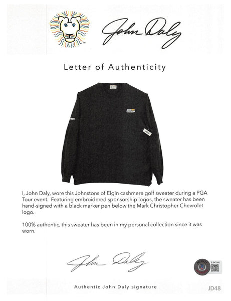 This Autographed Match Worn Dark Gray Mark Christopher Chevy Rock Bottom Golf Trump Johnstons of Elgin Cashmere Sweater has been Personally Signed by John Daly. This item is 100% Authentic to include a hologram by Beckett Authentication Services. This item will come with an affixed Beckett Authentication Services (BAS) authentication sticker, which includes a scannable QR code to verify authenticity. Please note that Beckett no longer provides serial-numbered COA cards, and the attached BAS sticker will serve as the complete authentication for this item. The authenticity can be verified on Beckett Authentication Services website. This match worn Johnstons of Elgin cashmere sweater has been worn by John Daly, and comes with a letter of Authenticity from John Daly certifying this is match worn & provenance of the item coming from his personal collection.