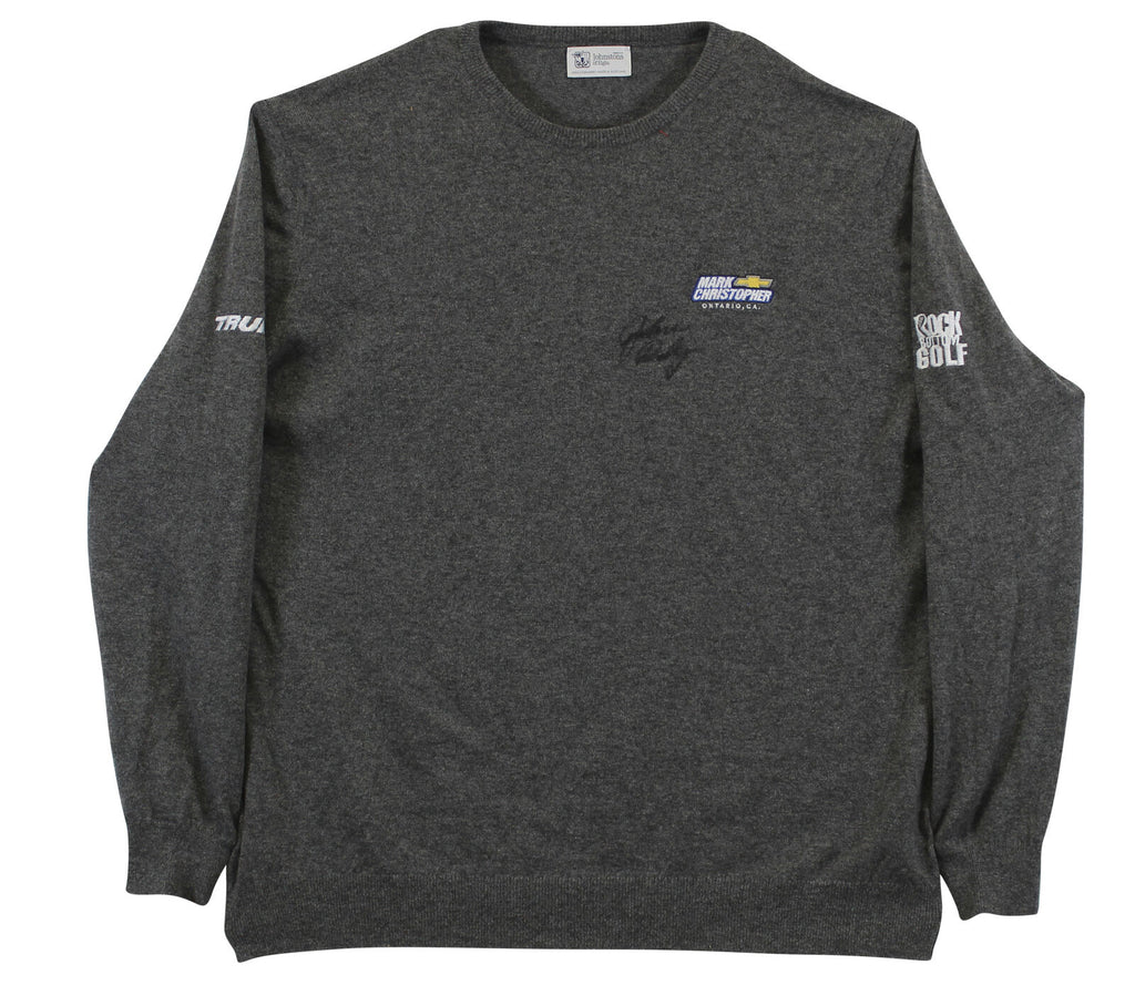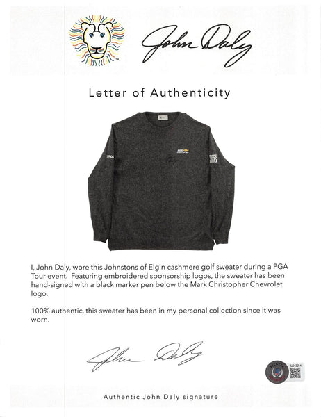 This Autographed Match Worn Dark Gray Mark Christopher Chevy Rock Bottom Golf Trump Johnstons of Elgin Cashmere Sweater has been Personally Signed by John Daly. This item is 100% Authentic to include a hologram by Beckett Authentication Services. This item will come with an affixed Beckett Authentication Services (BAS) authentication sticker, which includes a scannable QR code to verify authenticity. Please note that Beckett no longer provides serial-numbered COA cards, and the attached BAS sticker will serve as the complete authentication for this item. The authenticity can be verified on Beckett Authentication Services website. This match worn Johnstons of Elgin cashmere sweater has been worn by John Daly, and comes with a letter of Authenticity from John Daly certifying this is match worn & provenance of the item coming from his personal collection.