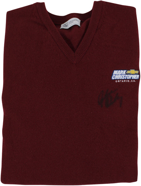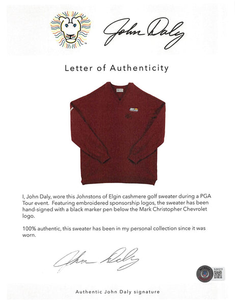 This Autographed Match Worn Brown Mark Christopher Chevy Rock Bottom Golf Trump Johnstons of Elgin Cashmere Sweater has been Personally Signed by John Daly. This item is 100% Authentic to include a hologram by Beckett Authentication Services. This item will come with an affixed Beckett Authentication Services (BAS) authentication sticker, which includes a scannable QR code to verify authenticity. Please note that Beckett no longer provides serial-numbered COA cards, and the attached BAS sticker will serve as the complete authentication for this item. The authenticity can be verified on Beckett Authentication Services website. This match worn Johnstons of Elgin cashmere sweater has been worn by John Daly, and comes with a letter of Authenticity from John Daly certifying this is match worn & provenance of the item coming from his personal collection.