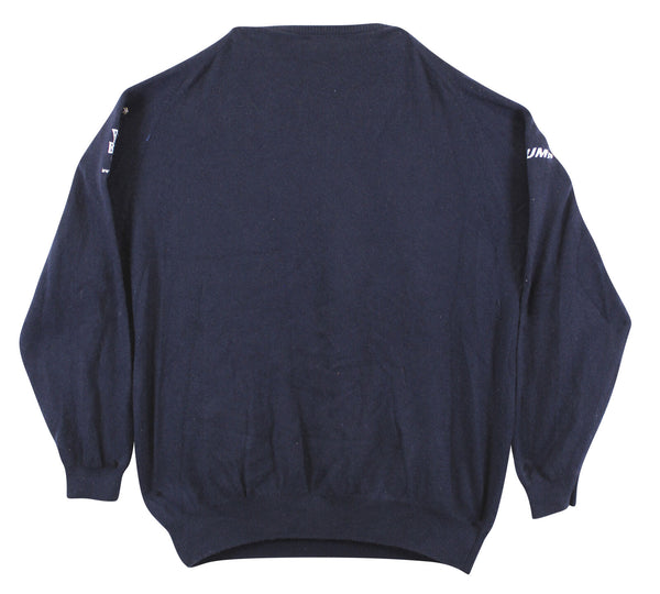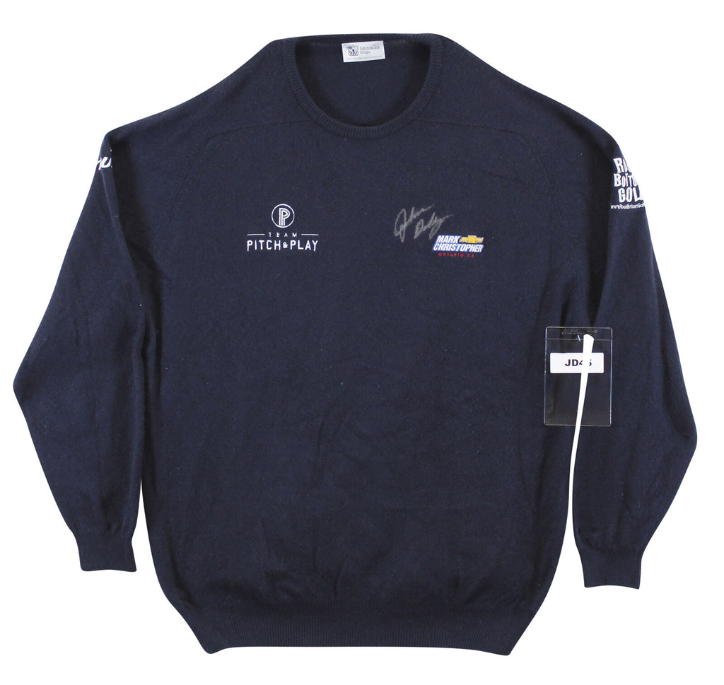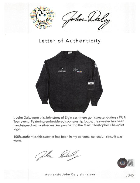 This Autographed Match Worn Navy Team Pitch & Play Mark Christopher Chevy Rock Bottom Golf Trump Johnstons of Elgin Cashmere Sweater has been Personally Signed by John Daly. This item is 100% Authentic to include a hologram by Beckett Authentication Services. This item will come with an affixed Beckett Authentication Services (BAS) authentication sticker, which includes a scannable QR code to verify authenticity. Please note that Beckett no longer provides serial-numbered COA cards, and the attached BAS sticker will serve as the complete authentication for this item. The authenticity can be verified on Beckett Authentication Services website. This match worn Johnstons of Elgin cashmere sweater has been worn by John Daly, and comes with a letter of Authenticity from John Daly certifying this is match worn & provenance of the item coming from his personal collection.