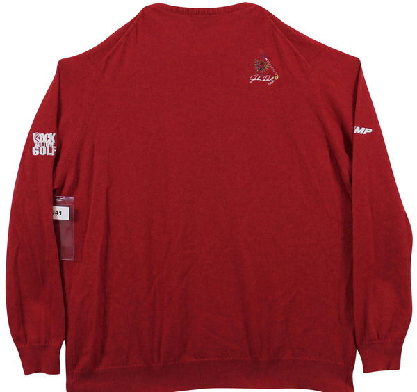 This Autographed Match Worn Red Mark Christopher Chevy Rock Bottom Golf Trump Johnstons of Elgin Cashmere Sweater has been Personally Signed by John Daly. This item is 100% Authentic to include a hologram by Beckett Authentication Services. This item will come with an affixed Beckett Authentication Services (BAS) authentication sticker, which includes a scannable QR code to verify authenticity. Please note that Beckett no longer provides serial-numbered COA cards, and the attached BAS sticker will serve as the complete authentication for this item. The authenticity can be verified on Beckett Authentication Services website. This match worn Johnstons of Elgin cashmere sweater has been worn by John Daly, and comes with a letter of Authenticity from John Daly certifying this is match worn & provenance of the item coming from his personal collection.