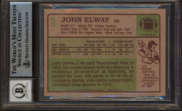 This Autographed Auto Graded Gem Mint 10! 1984 Topps #63 Rookie Card has been Personally Signed by John Elway of the Denver Broncos. This item is 100% Authentic, it comes slabbed and authenticated by Beckett Authentication Services. The authenticity can be verified on Beckett Authentication Services website.