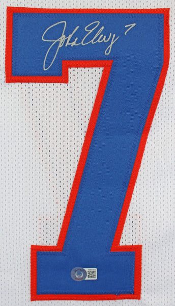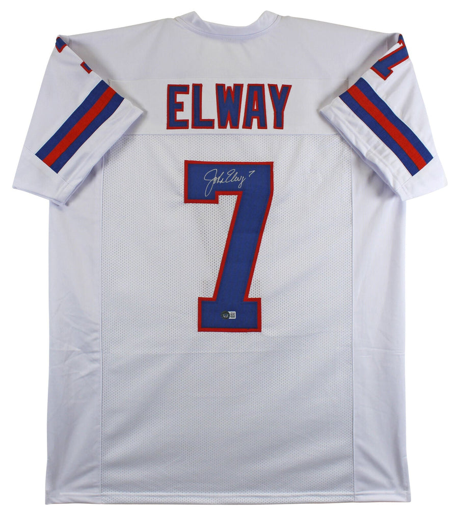 This Autographed White Pro Style Jersey has been Personally Signed by John Elway of the Denver Broncos. This item is 100% Authentic to include a hologram by Beckett Authentication Services. This item will come with the new Beckett Authentication hologram that has a scannable QR code rather than the traditional COA. If you would like to have a COA, you are welcome to reach out to Beckett for a printed certification once you receive your item. This is a BAS Witnessed Protection Program item which means a Beckett Authentication Service representative was present when this item was being signed. We conducted an autograph signing with John Elway where multiples of the same item were signed. While the photographs are representative of this item, the size, placement and strength of the signature may vary. Each item is hand signed, therefore, each autograph is unique. This item can be verified through BAS Witnessed. This is a X-Large sized, non-branded, custom-stitched Jersey.