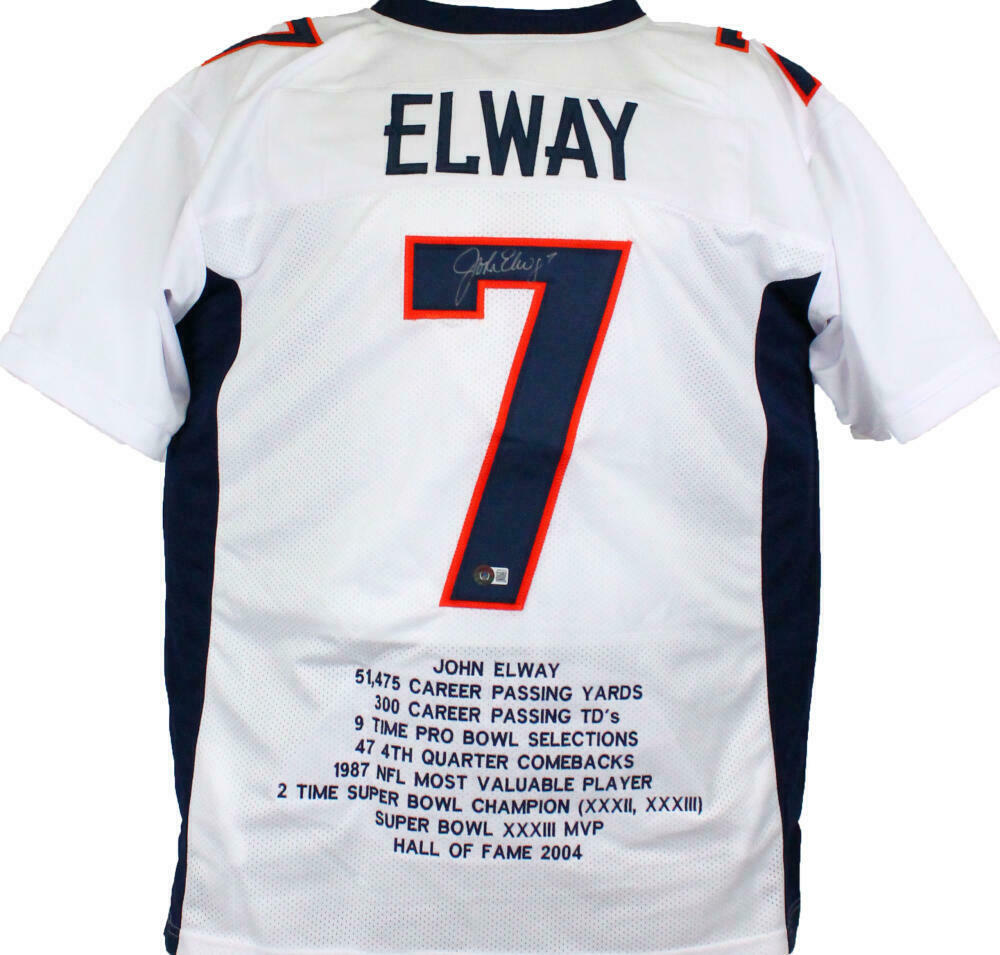John Elway Autographed White Pro Style STAT Jersey- Beckett W Hologram *Silver THIS IS NOT AN NFL JERSEY. THIS HAS NO TAGS, NO LOGOS, NO EMBLEMS. This is a John Elway of the Denver Broncos hand autographed custom made (Non Name Brand) authentic style (stitched letters and numbers) jersey. This item has a Beckett Witnessed Authentication, which comes with a numbered hologram and a generic Certificate of Authenticity. You can view this item on the Beckett Authentication website and it shows when and where the item was signed. It was signed either at a public autograph appearance or a private signing. This is a stock photo of the item. Although you may not receive this exact item, the item you receive is virtually identical, brand new, and in great shape. Jersey size is XL.