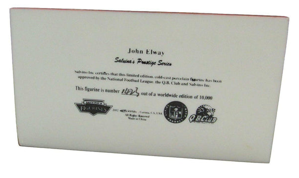John Elway Denver Broncos 2002 Salvino's Porcelain Figure Prestige Series. It is brand new in the original box with certificate of authenticity. It has never been displayed and is hand numbered out of 10,000. It is in mint condition and has been stored in a smoke-free dry environment. This is a 7" cold cast porcelain figurine.
