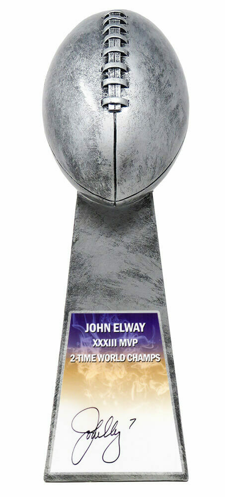 John Elway signed football world champion 15 inch replica silver trophy. Item comes with a Schwartz Sports Memorabilia tamper-proof numbered hologram and Certificate of Authenticity which can be verified online.