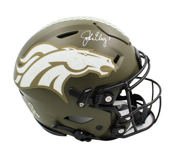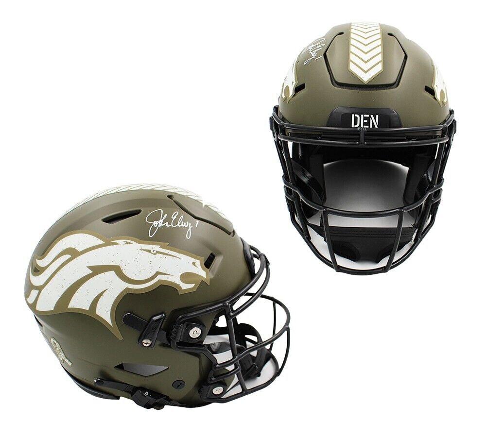 A Denver Broncos Speed Salute To Service Flex Authentic NFL Helmet hand signed by John Elway. The item and signature are in excellent condition. John was drafted into the NFL in 1983 Round:1,Pick:1.John is a 2x Super Bowl champion, a Super Bowl MVP, NFL Most Valuable Player in 1987, and was NFL Man of the Year in 1992. AUTHENTICATION: Your item is tagged with a SmarTag powered by Prova Technology, which gives you digital access to your items authentication records, which includes a proof picture from the signing.