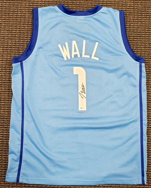 This is a Light Blue Custom Jersey that has been hand signed by John Wall. This is a custom jersey with no name brand. The approximate size is XL. It has nice sewn in name and numbers. This item has been certified authentic by Beckett (BAS) and comes with their tamper-proof sticker and matching certificate of authenticity.