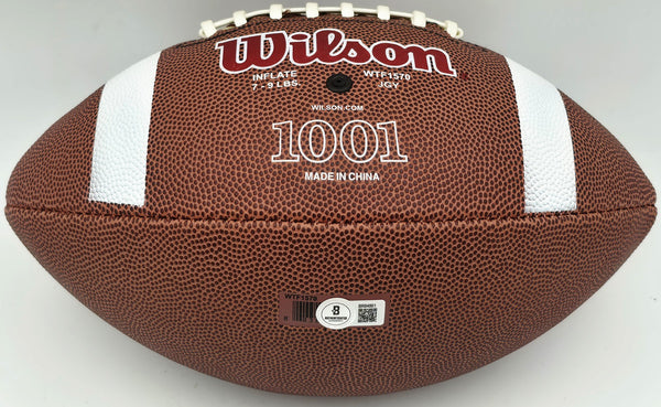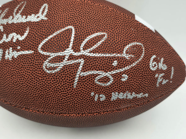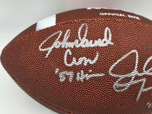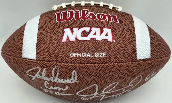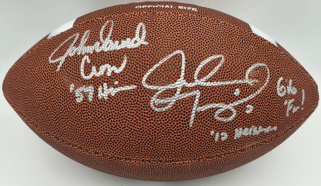 This is a NCAA Wilson Football that has been hand signed by John David Crow & Johnny Manziel. This item was inscribed "57 Heisman & '12 Heisman." This item has been certified authentic by Beckett Authentication (BAS) and comes with their tamper-proof QR Code hologram.