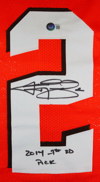 Johnny Manziel Autographed Orange Pro Style Jersey w/insc.-Beckett W Hologram *Black THIS IS NOT AN NFL JERSEY. THIS HAS NO TAGS, NO LOGOS, NO EMBLEMS. This is a Hand Autograph of Johnny Manziel on a custom made (Non Name Brand) authentic style jersey with stitched letters and numbers. Inscribed 2014 1st Round Pick. This item has a Beckett Witness Authentication, which comes with a numbered hologram and a QR code for verification. You can view this item on the Beckett Authentication website. It was signed either at a public autograph appearance or a private signing. This is a stock photo of the item. Although you may not receive this exact item, the item you receive is virtually identical and brand new in great shape. Jersey size is XL.