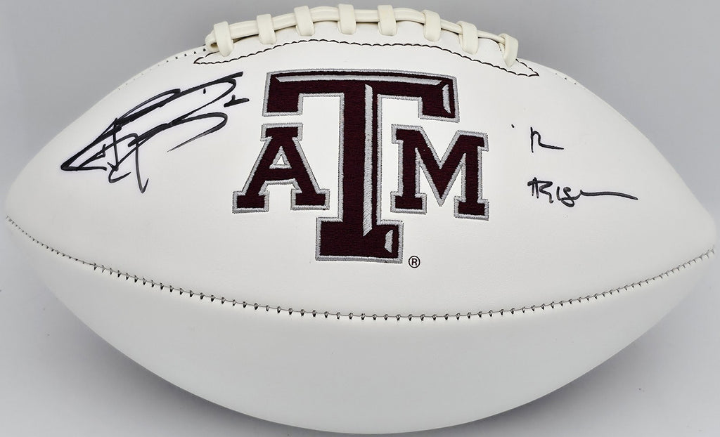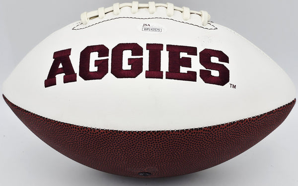 This is an Texas A&M Aggies Official White Logo Football that has been hand signed by Johnny Manziel. This item was inscribed "12 Heisman." This item has been certified authentic by JSA and comes with their tamper-proof hologram BUT is missing the matching certificate of authenticity.
