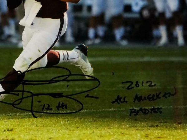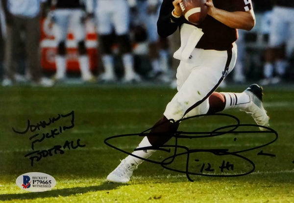 Johnny Manziel Signed Texas A&M 8x10 Rolling Out Photo w/3 Isnc- Beckett Auth *Black This is a hand autographed 8x10 Photo of Johnny Manziel of the Texas A&M Aggies. This item has a Beckett Authentication, which comes with a Beckett numbered sticker and a matching Beckett Certificate of Authenticity. You can view this item on the Beckett Authentication website. It was signed either at a public autograph appearance or a private signing. This is a stock photo of the item. Although you may not receive this exact item, the item you receive is virtually identical and brand new in great shape.